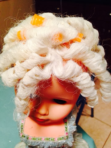 To style the hair, get some Halloween straws from the dollar store, (they are larger than traditional straws.) Cut them into sections,, and roll the hair. Since I wanted Marie Antoinette sausage curls, I wound the hair on in a vertical fashion and pushed a straight pin through the scalp to hold it in place. Synthetic doll hair is not easy to curl. I dunked the head in a bowl of boiling water for 3 minutes, then in ice water for 2 minutes. And let it air dry. The hair got kind of fried, but it was still workable. I would do less time in the hot water next time.
